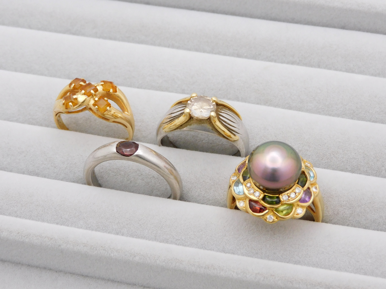 こちらはK18、およびプラチナ900、そしてプラチナ900とK18のコンビリングになります。右手前の存在感のあるK18リングは、ブラックパールの周りをグリーントルマリンやペリドットにアメシスト、トパーズにガーネット、そしてダイヤモンドが敷き詰められた優美なデザイン♪
