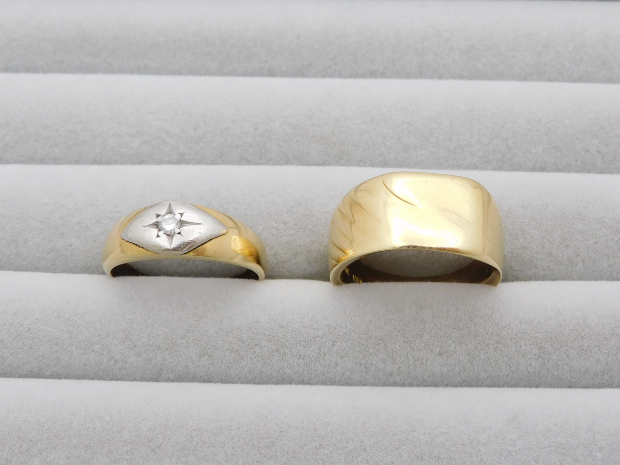 続いてご紹介するのはボリュームのあるK18リングと、K18とプラチナ900のコンビリング。金相場がかなりの高値を付けているため、重さのある金製品は買取額も高額となります♪
