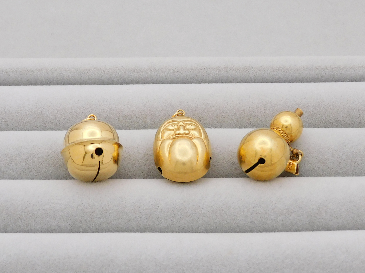 続いてこちらは、K18素材の根付で、ひょうたん・だるま・鈴がデザインされています。ひもが通されていましたが、査定するうえで外して重さを計測しました。