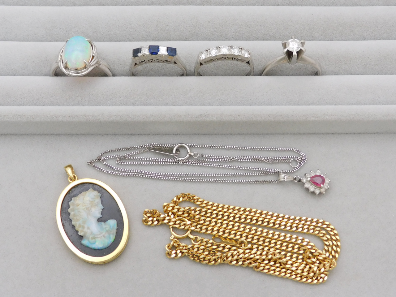 今回ご紹介するお買取り品は、プラチナのリングやネックレスに、K18カメオペンダントネックレス!ダイヤモンドやサファイア、ルビーにオパールなど色石付きのお品もたくさんお持ちいただきました♪ もちろん、宝石の付加価値もプラスで計算してお買い取りしております。
