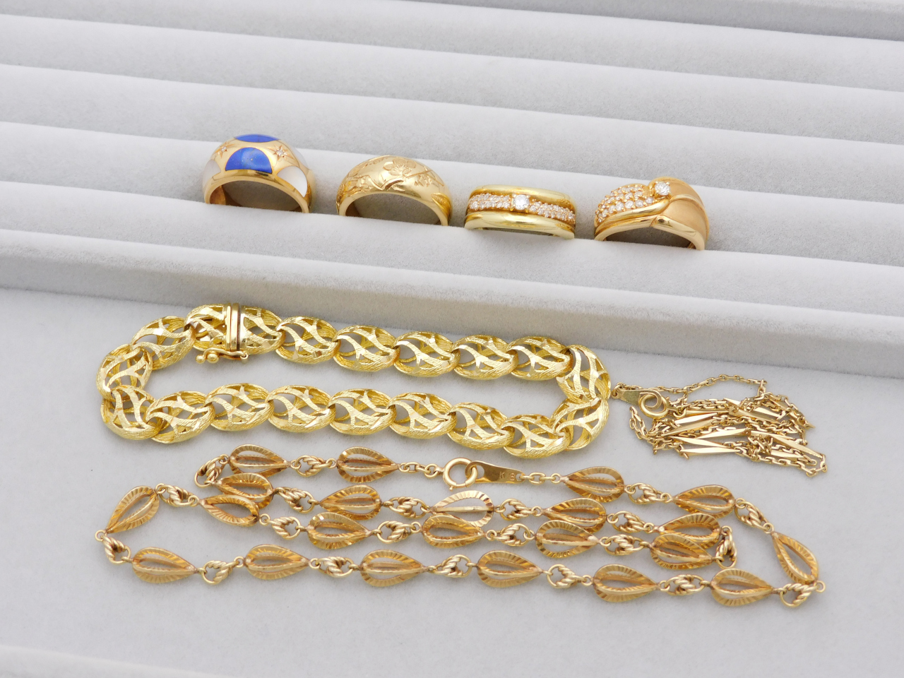 最初にご紹介するのは、全てK18素材のジュエリー!指輪にブレスレット、ネックレスをお持ちいただきました。ダイヤモンドリングは、もちろんダイヤの価値もプラスしてお買取りしております。