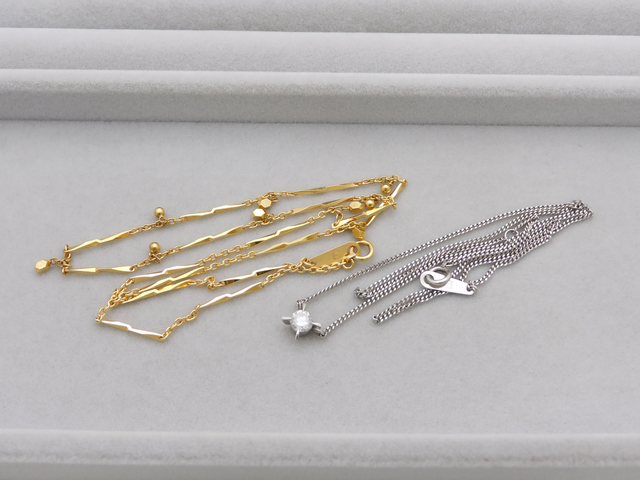 最後にご紹介するのはK18ネックレスと、プラチナ900ダイヤモンドネックレス。ダイヤモンドは0.36カラットあり、ダイヤの金額ももちろんプラスしてお買取りしてります。