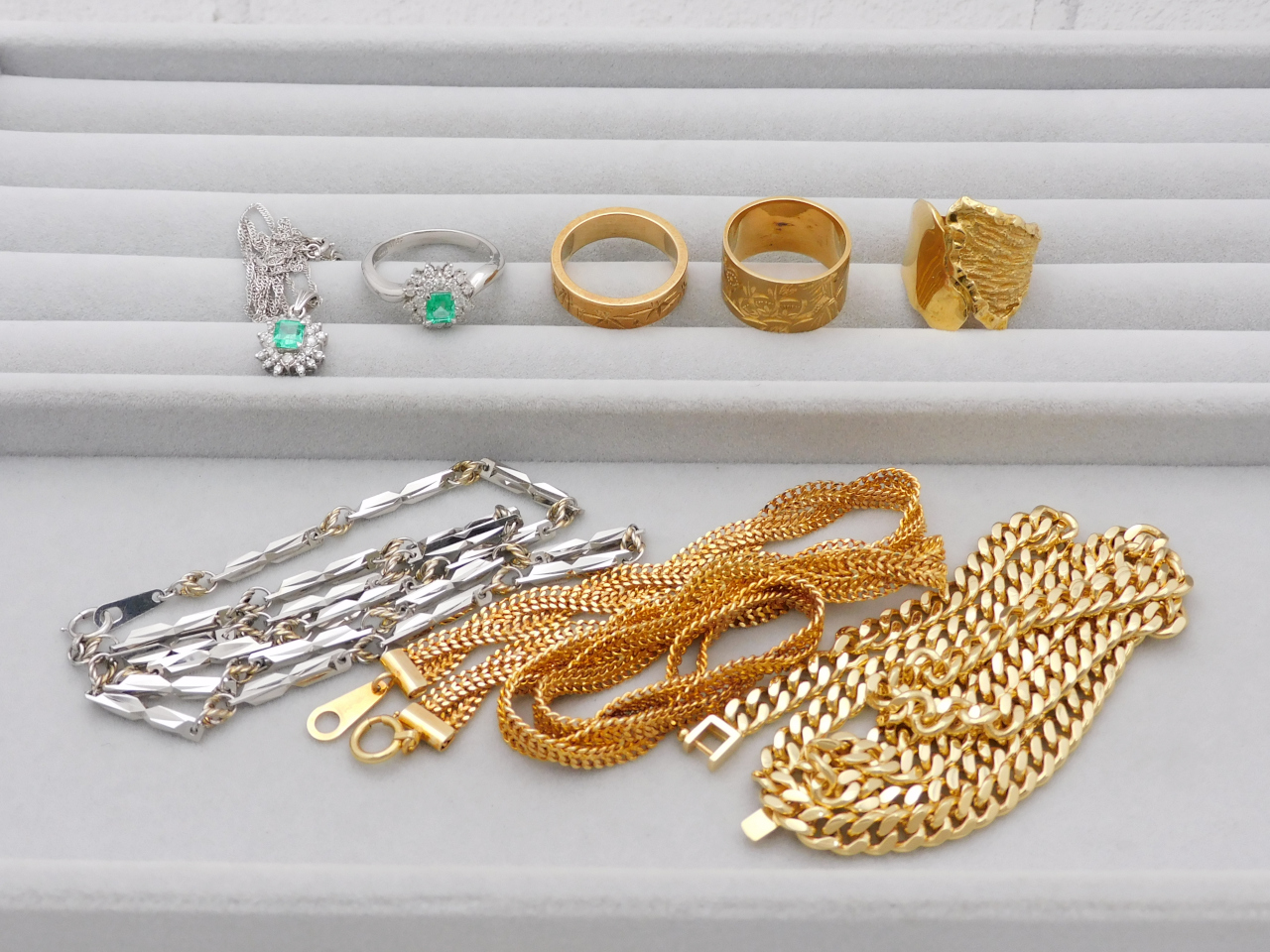 K18リングをはじめ、K18喜平ネックレスに、Pt850ネックレスなどをお買取りさせていただきました♪ また、エメラルドやダイヤモンドがセットされたプラチナジュエリーもお持ちいただきました。