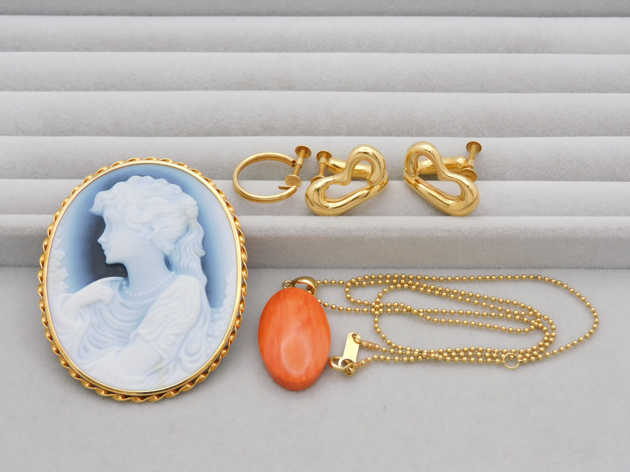 今回お売りいただいたお品は、カメオブローチをはじめ、もも珊瑚ネックレスに、イヤリングといったK18ジュエリーを中心とする貴金属! 以前にもTamakiをご利用いただいたことのあるお客様で、査定額をお伝えしたところ、金額の高さに驚かれていました(#^.^#)