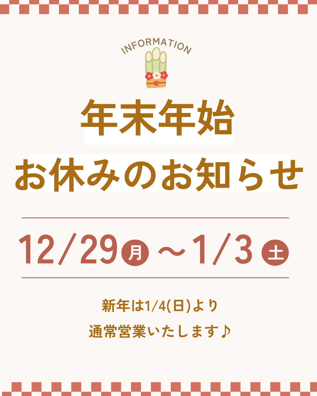 12/29(月)~1/3(土) 年末年始 お休みのお知らせ