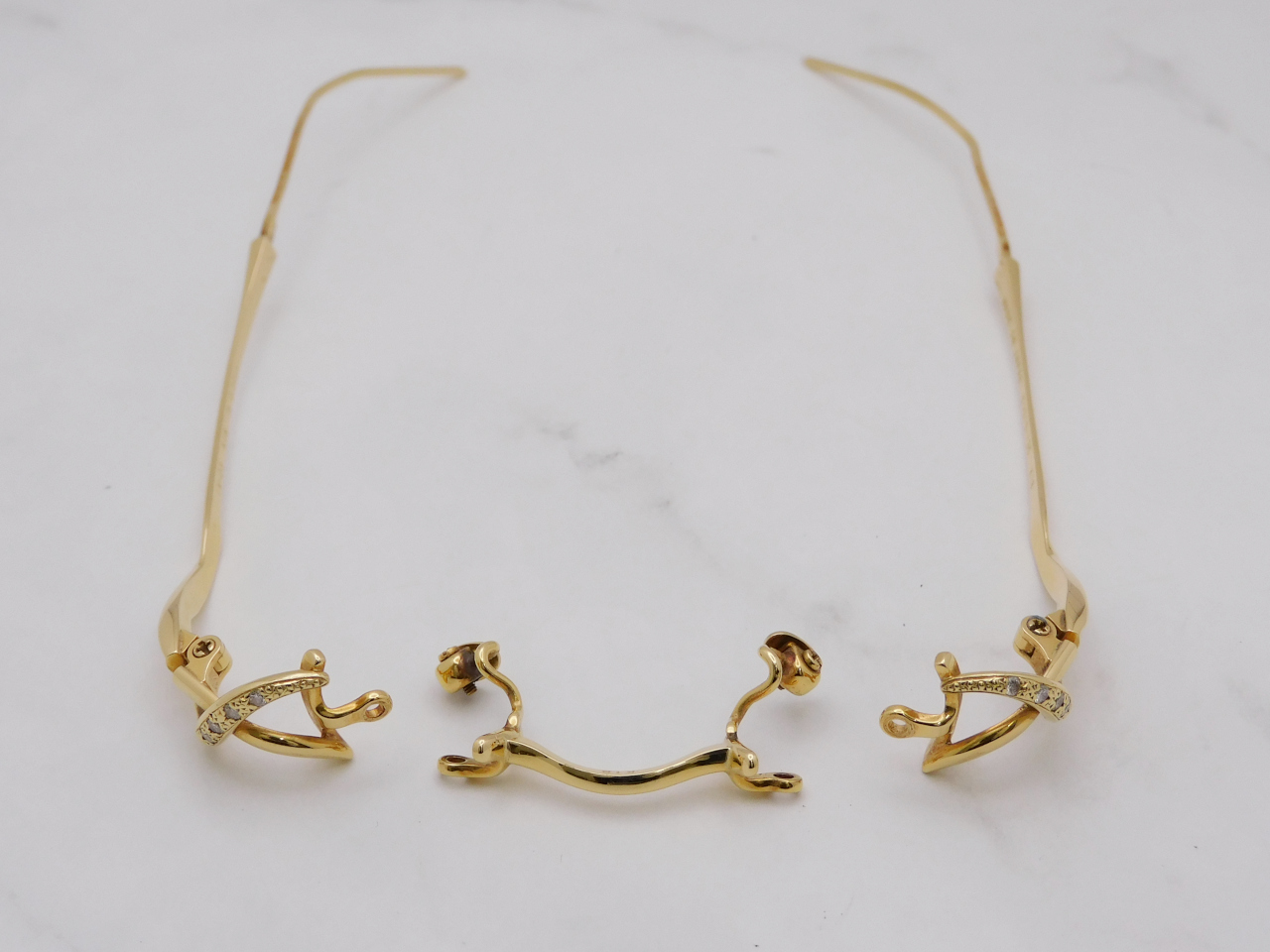 そしてこちらはK18素材のメガネフレーム!お客様にご了承を得たうえで、レンズやプラスチックパーツを取り外し、重さを計測してお買取りしました!